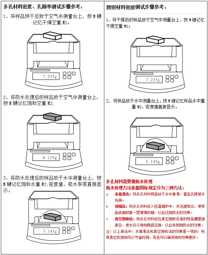 标准规范:根据ASTM B311、MPIF Standard 42、JIS Z2505、GB/T5163等规范。可适用于封蜡法、煮沸法、真空饱和法、硅油媒介液法量测,依据阿基米德浮力法,快速读取量测数值。