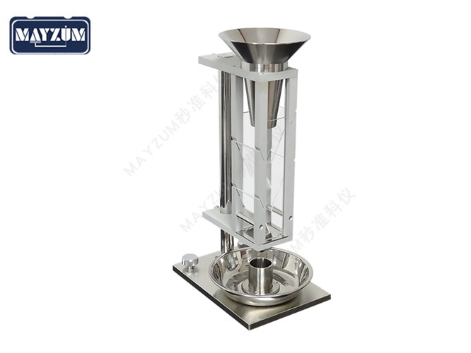 | 上部组合漏斗:由二个圆锥形漏斗装配而成,期间由一段圆柱隔开,并放入一个孔径为1.18mm的黄铜筛网; 布料箱:横断面为正方形,内有四块玻璃板斜镶嵌在铝制的框架上,框架前后两壁面是玻璃挡板,并易于清洗时拆装; 玻璃板:4块光学石英玻璃板; 方形漏斗:为60°的方锥体,下端口径为12.5mm×12.5mm; 圆柱杯:容积为25±1.25px3,内径为φ30±1mm; 溢料盘:用于盛装多余的粉末; 台架:用于支撑上部组合漏斗、布料箱、方形漏斗、圆柱杯、溢料盘、并使他们同轴地处于下图中所示的高度。用台架的三个螺钉(两个可调,一个不可调)调节水平; 电子天平(选购):用于称量粉末样品的重量,精确到0.05g。 |