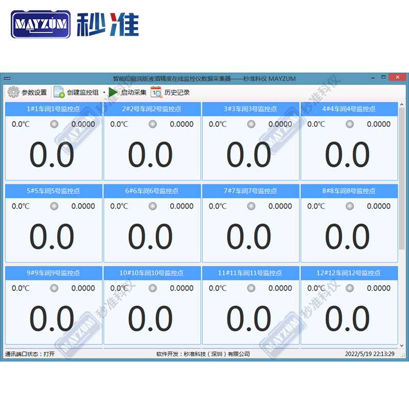 三、秒准(mayzum)智能印刷润版液酒精度在线监控仪数据采集器,中控室直观查看车间工位点数据功能界面显示参考: