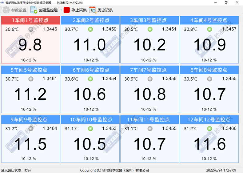 9、标配浓度看板和报警器,挂于车间通道上,多个生产线的浓度数据一目了然,异常数据自动报警,确保产品品质始终稳定可靠;