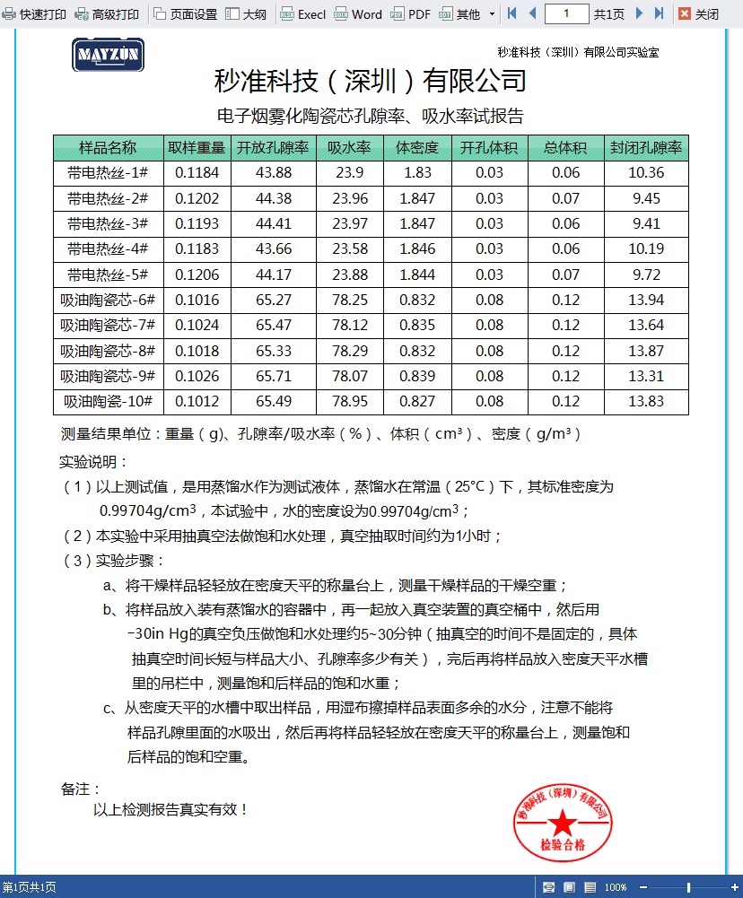 结果显示 | 体密度(媒介法)、视密度、湿密度、视孔隙度、吸水率、开放孔体积、 封闭孔体积、总孔隙率;粉体真密度。 | ||||