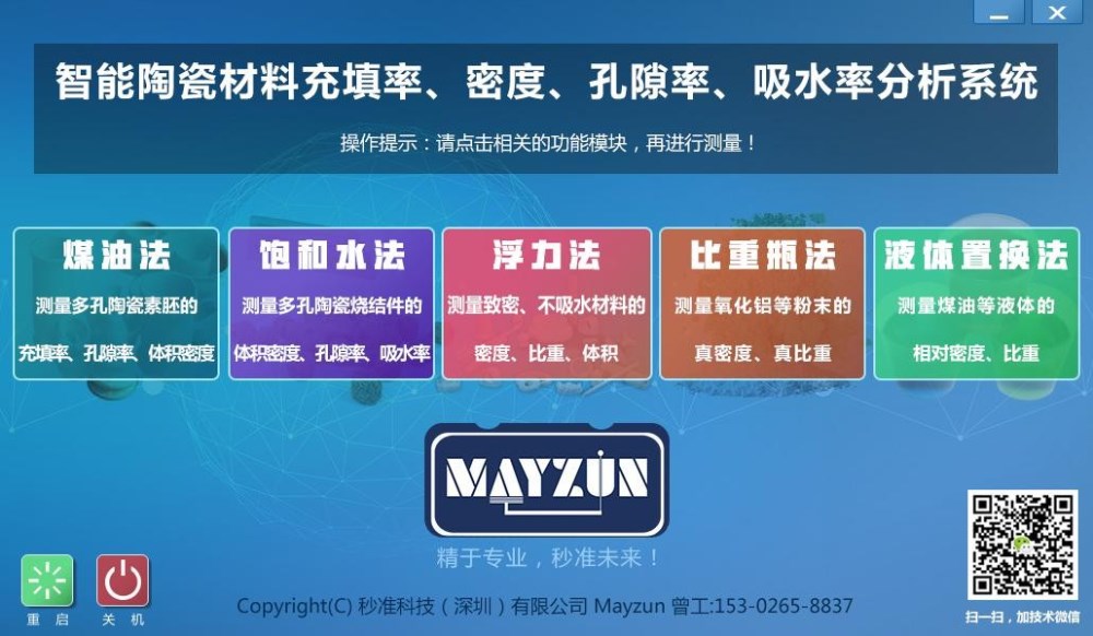 功能一:针对有孔隙吸水性的陶瓷产品,可直接读取体密度(媒介法)、视密度、湿密度、视孔隙度、吸水率、开放孔体积、封闭孔体积、总孔隙率。