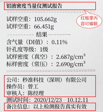郑州**合金科技有限公司通过朋友介绍联系我们到公司,王工分享铝液当量仪用途:在生产铝液铝合金浇铸件前,品质把控的好帮我们因为密度当量仪是在铝合金铸件浇注前,通过检测合金的密度当量检查铝液的精炼效果的一种精密检测仪器。密度当量值定量地反映铝合金中游离氢气、氧化夹渣物含量,从而能够判定合金精炼的效果好坏。是保证铸件质量的关键手段。需要一台方便在炉前检测的设备,方便于他们快速检测判定铝液品质。